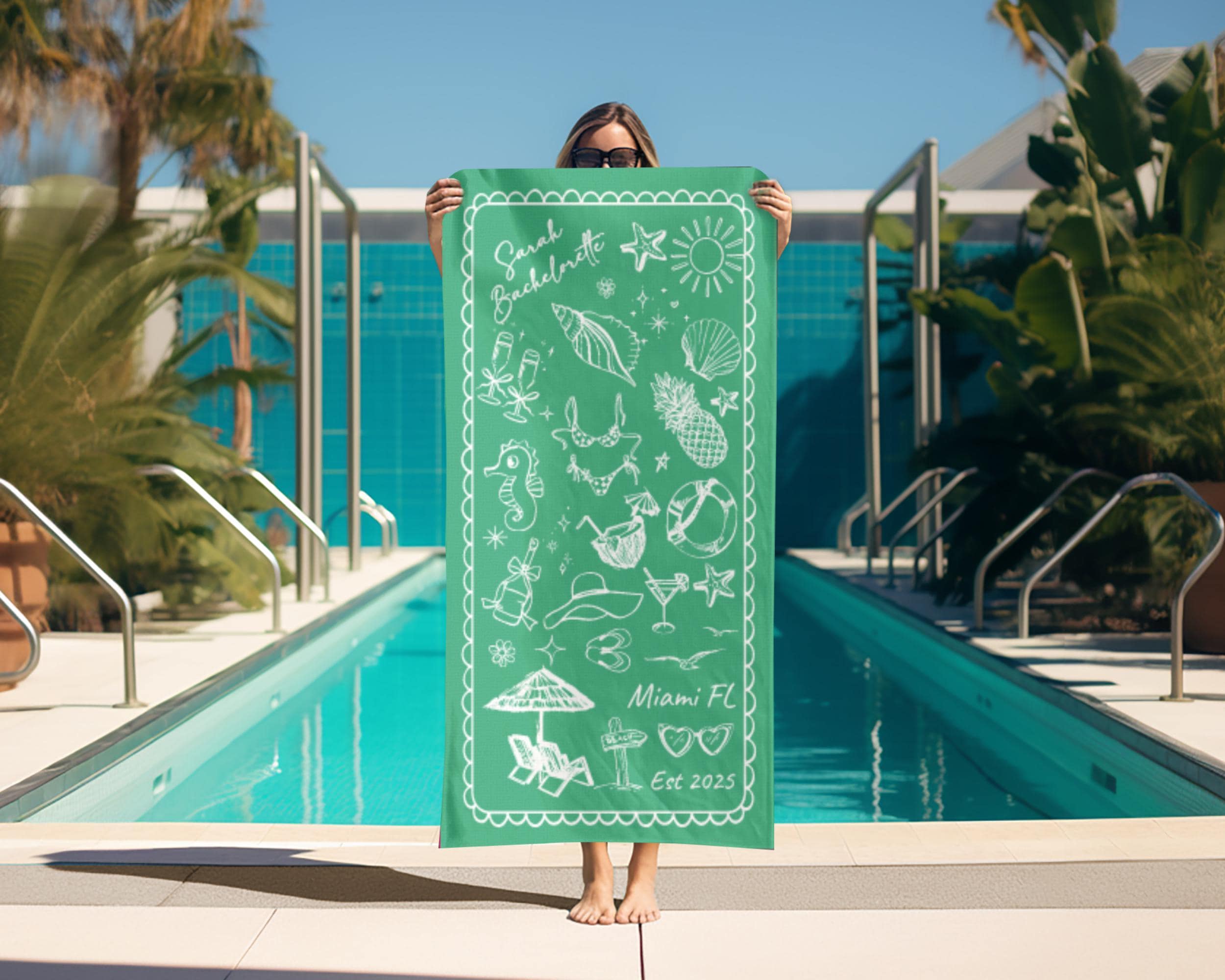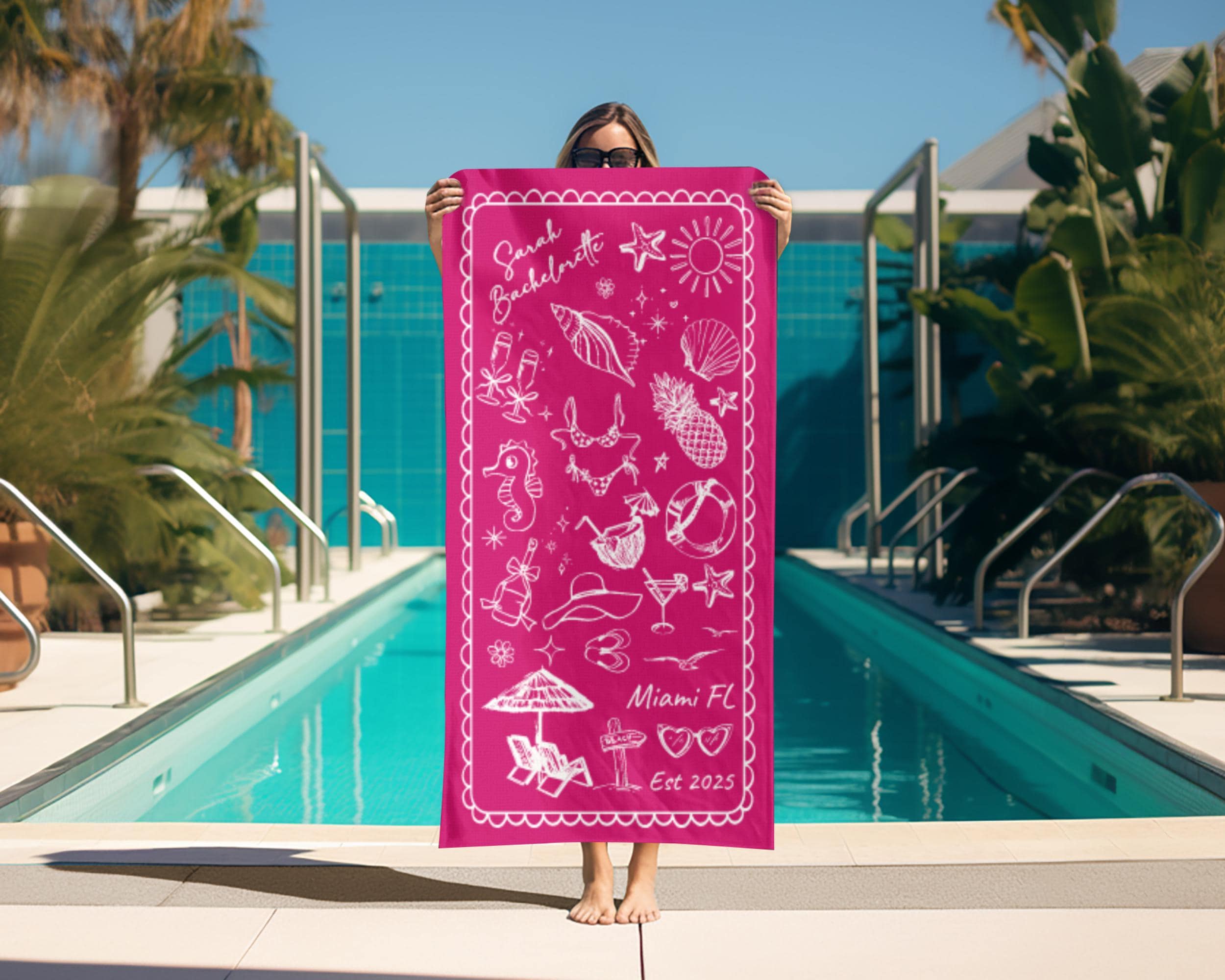 Personalized Bachelorette Beach Towel, Custom Location And Name Bachelorette Party Pool Towel, Bachelorette Trip Gift, Bride, Bridal Shower