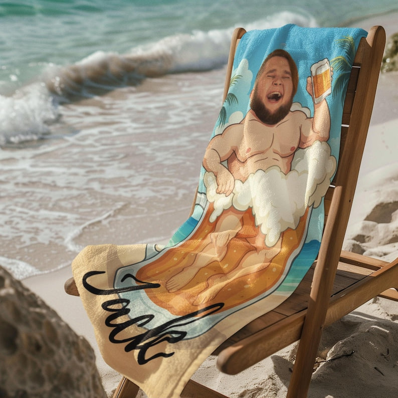 Personalized Beach Towel, Custom Face & Name in Beer Mug,Pool Towel Personalized Beach,Ideal for Beach Days, Pool Parties, and Vacation Gift