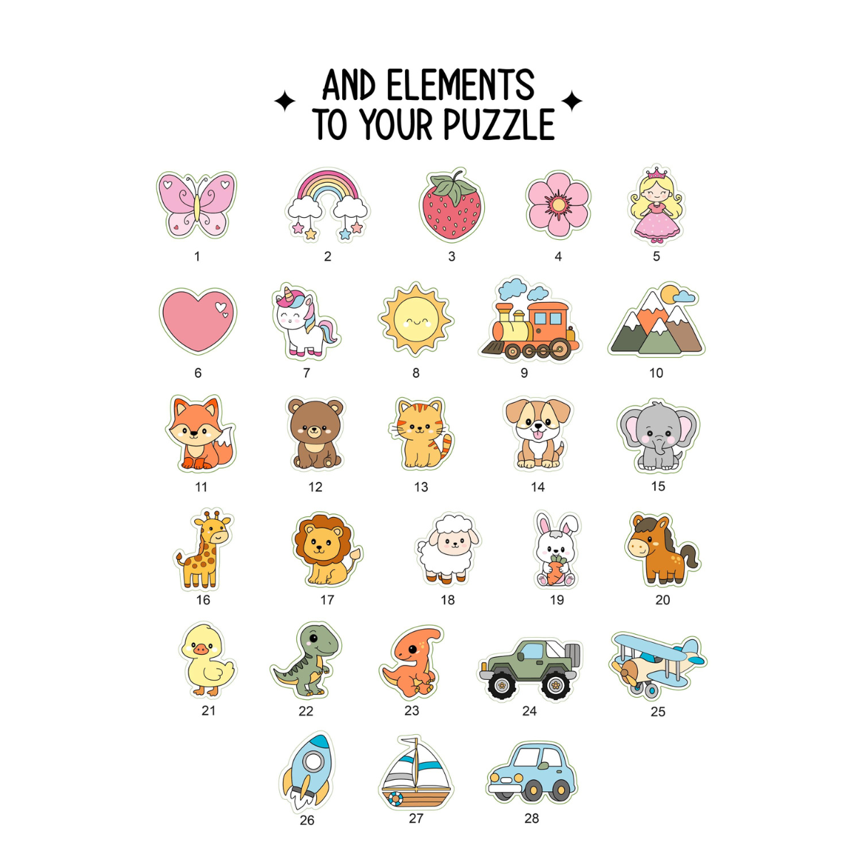 Our puzzle is covered with high-quality and vivid color printing. The designs are permanently pressed directly onto the standing, creating, an everlasting image that will NOT peel off or fade. 1 piece will be designed as a letter, an animal, or other character. The specified sizes refer to a puzzle of 5-6 pieces.