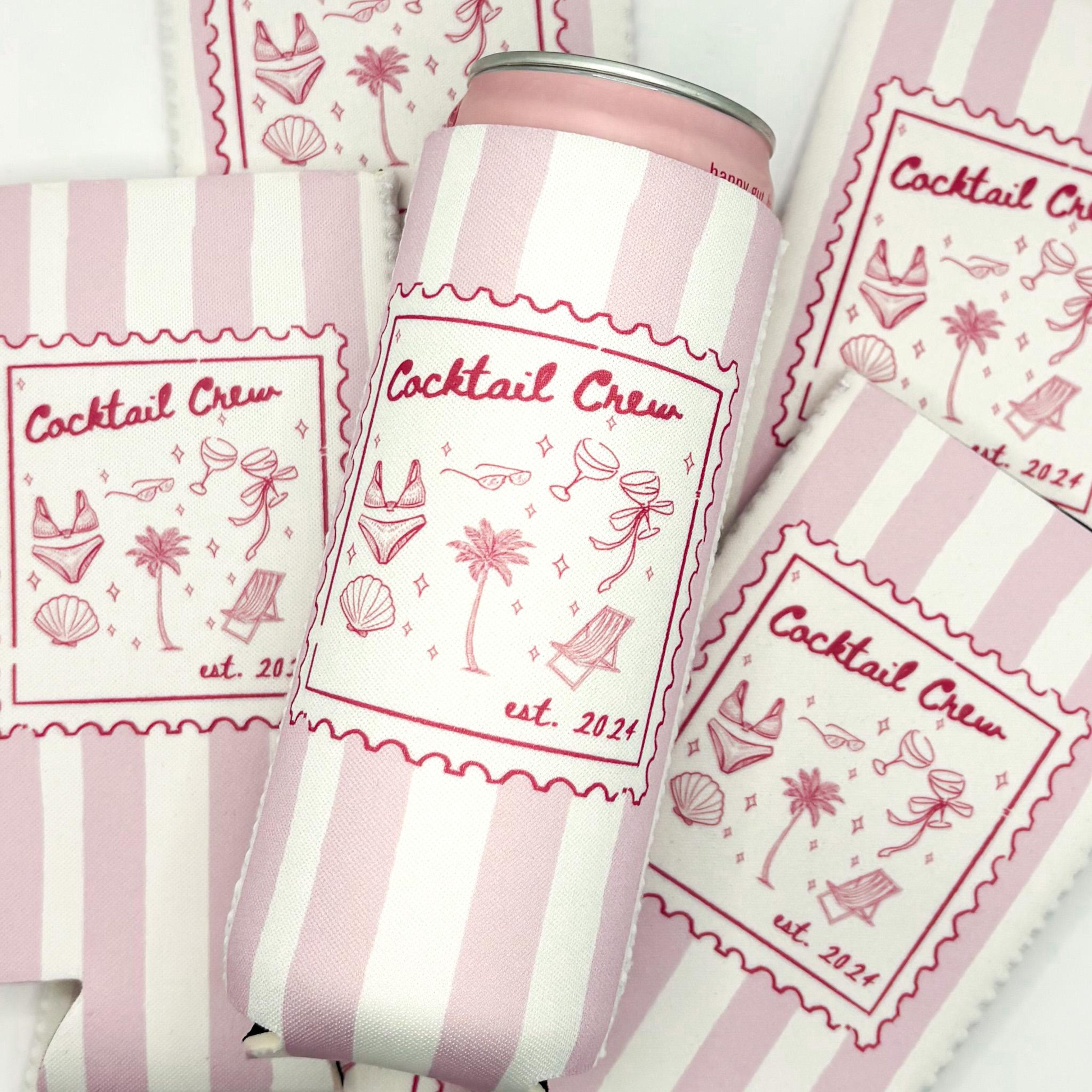 Celebrate your beach weekend with this personalized coastal bachelorette can cooler — perfect for bridal parties, beach bachelorettes, and wedding party favors. These custom drink holders feature a chic striped design and can be personalized with the bride’s name, date, and location.