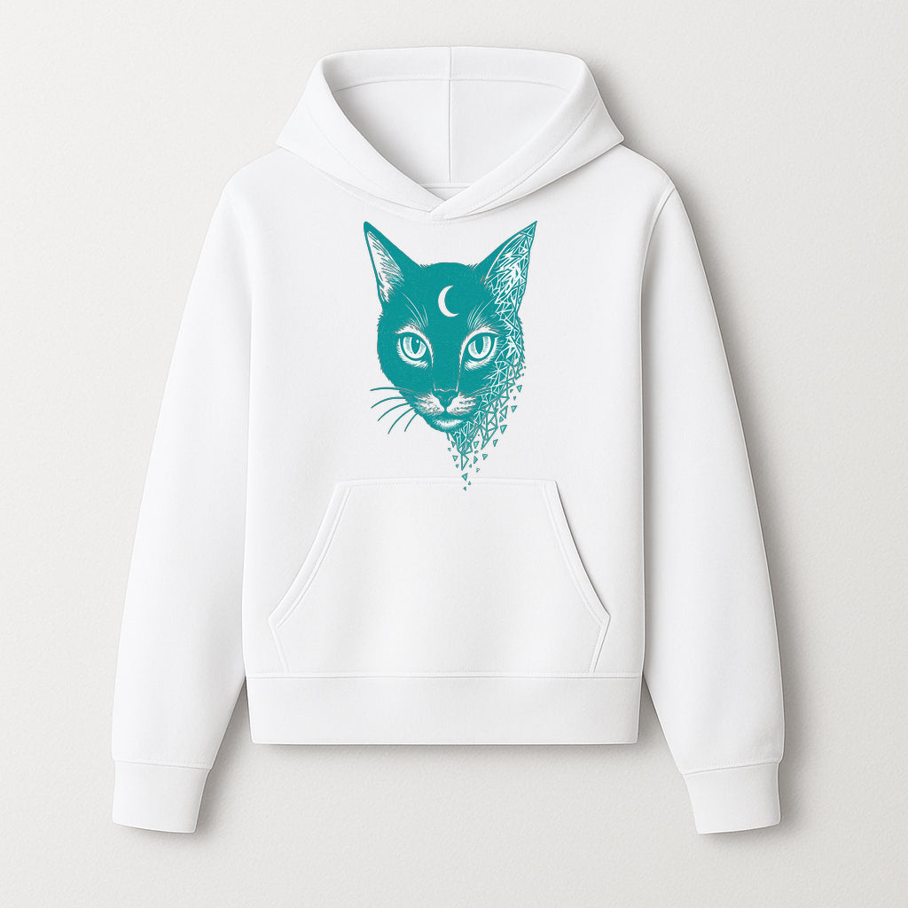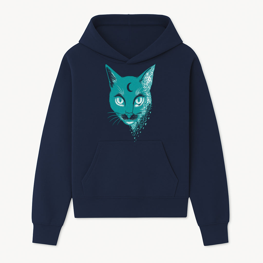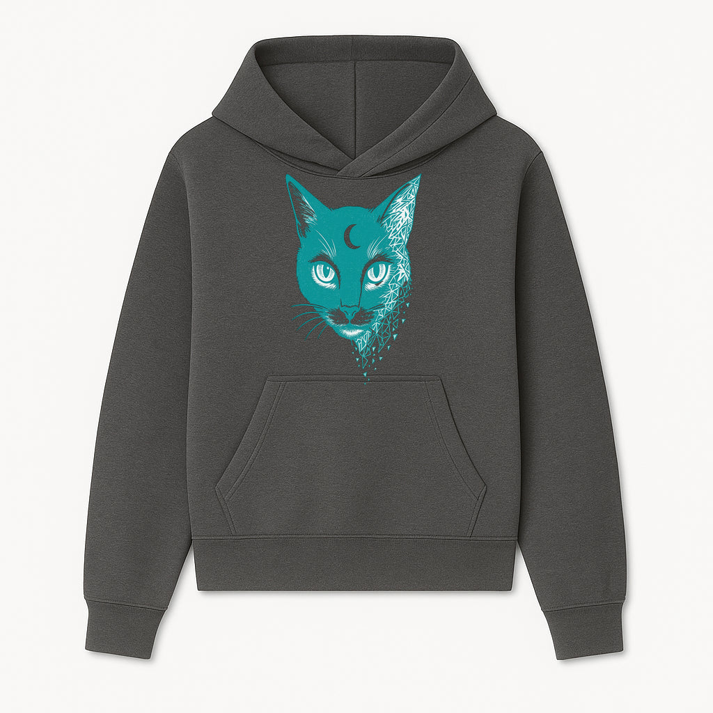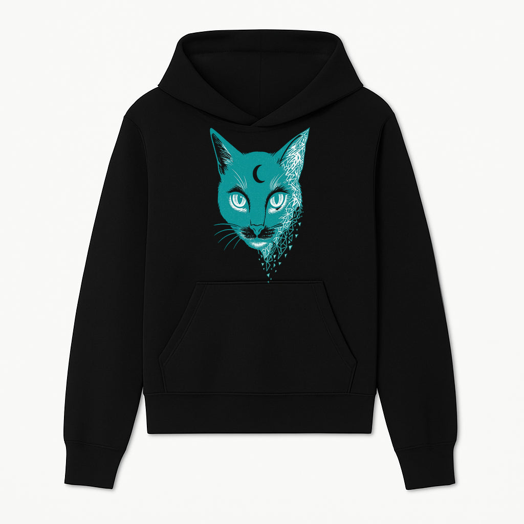 Geometric Cat Art Print with Moon Accent | Teal Abstract Cat Design | Modern Wall Decor for Cat Lovers and Home Aesthetics - Hoodie