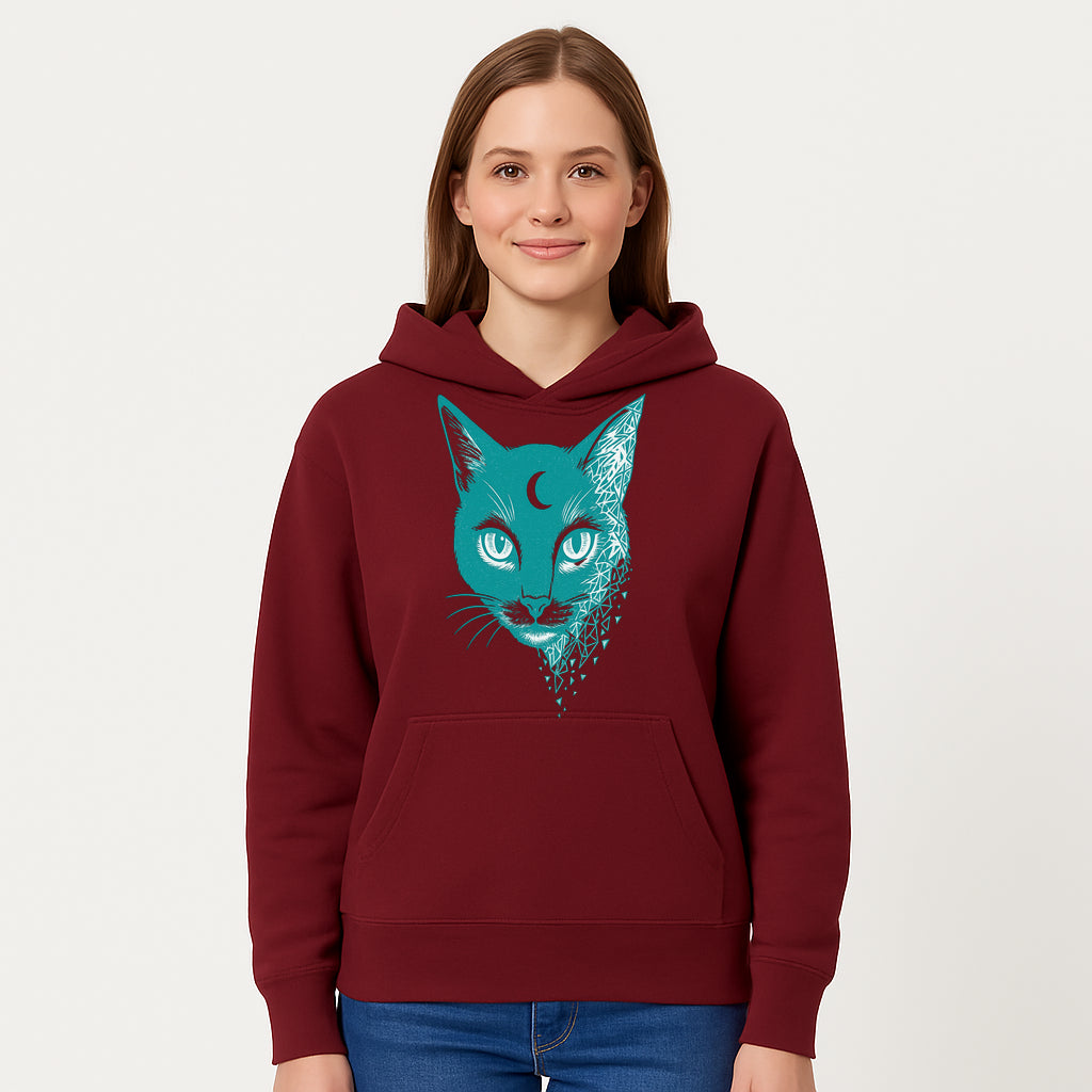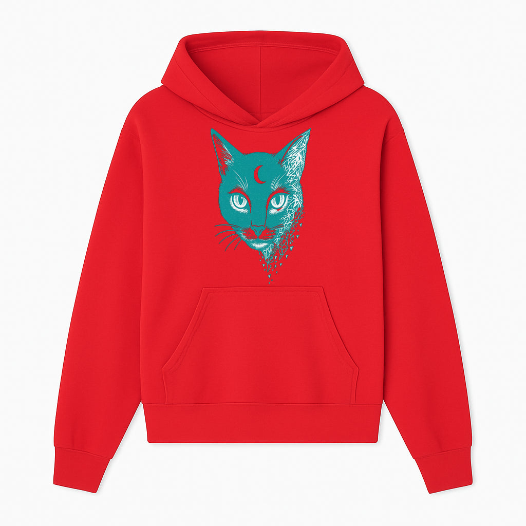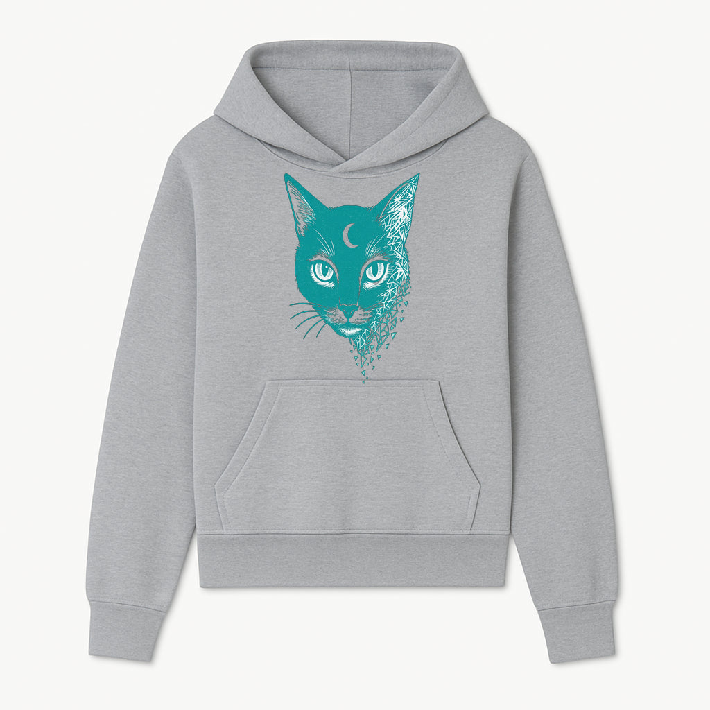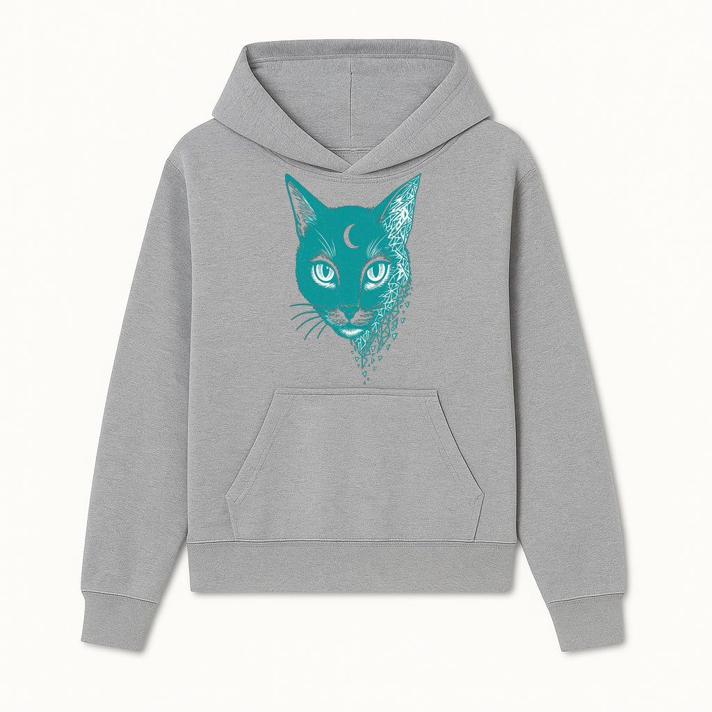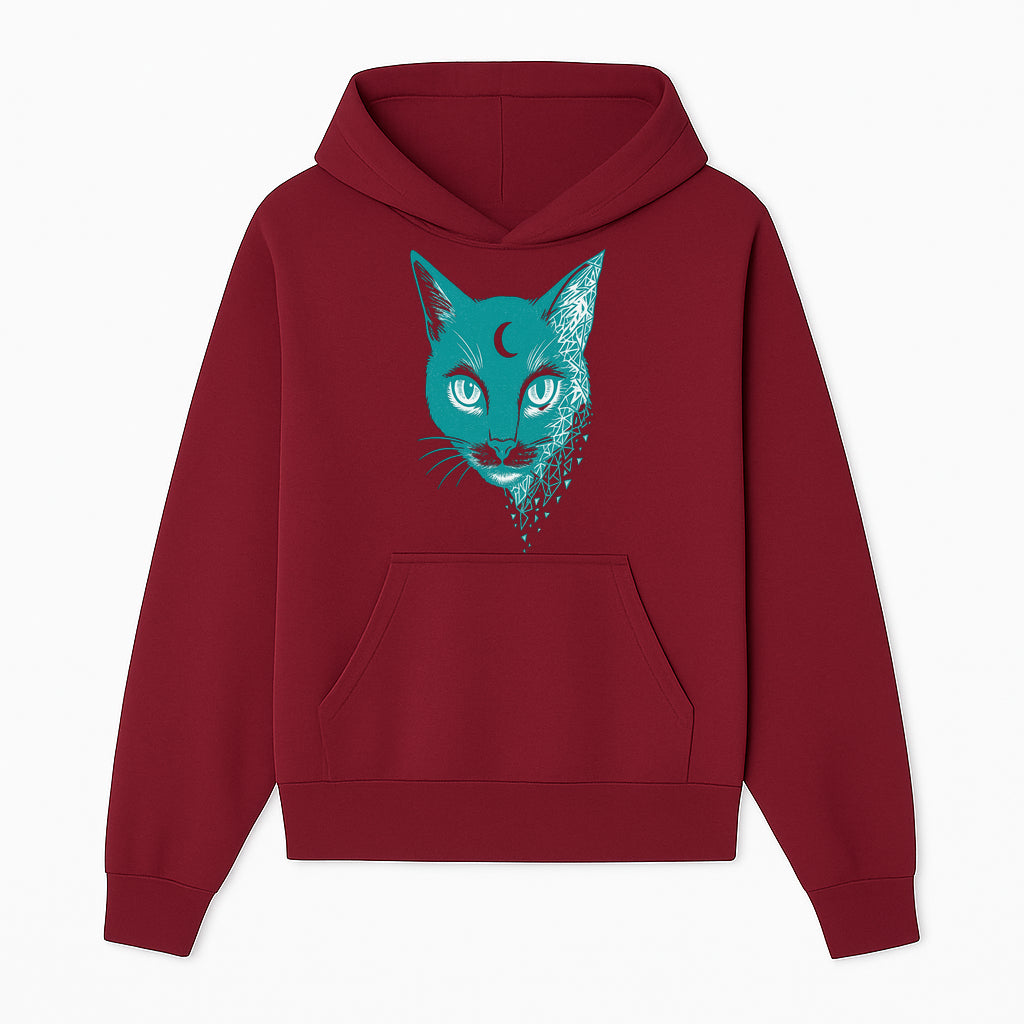 Geometric Cat Art Print with Moon Accent | Teal Abstract Cat Design | Modern Wall Decor for Cat Lovers and Home Aesthetics - Hoodie