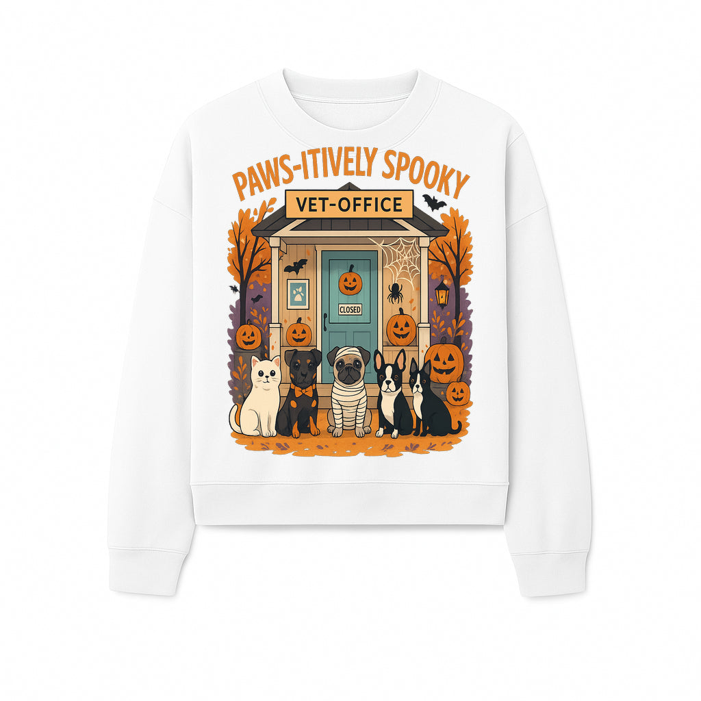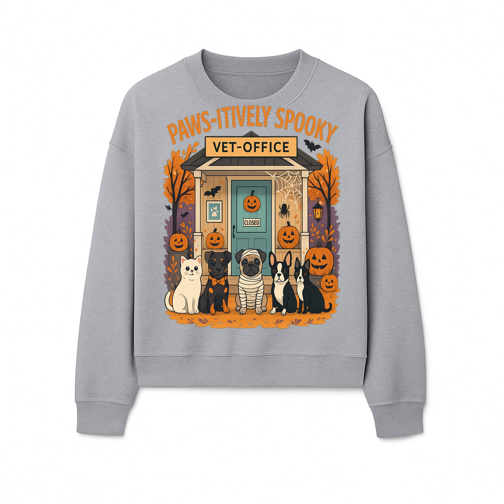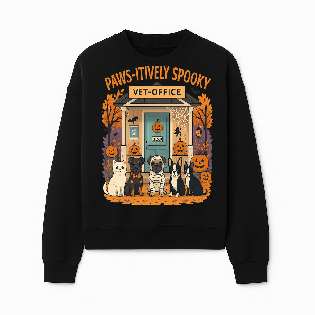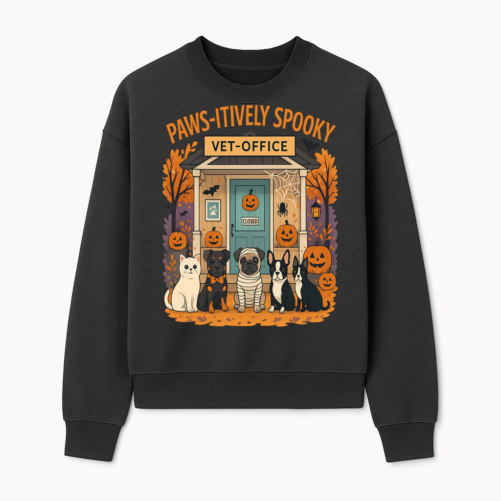 Paws-itively Spooky Vet Office Halloween Greeting Card with Cute Cats and Dogs, Pumpkin Decor, Perfect for Pet Lovers - Sweatshirt