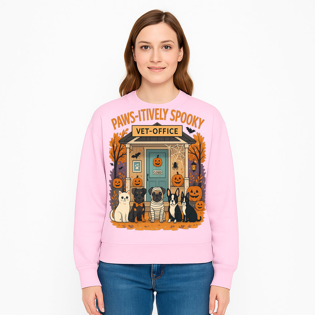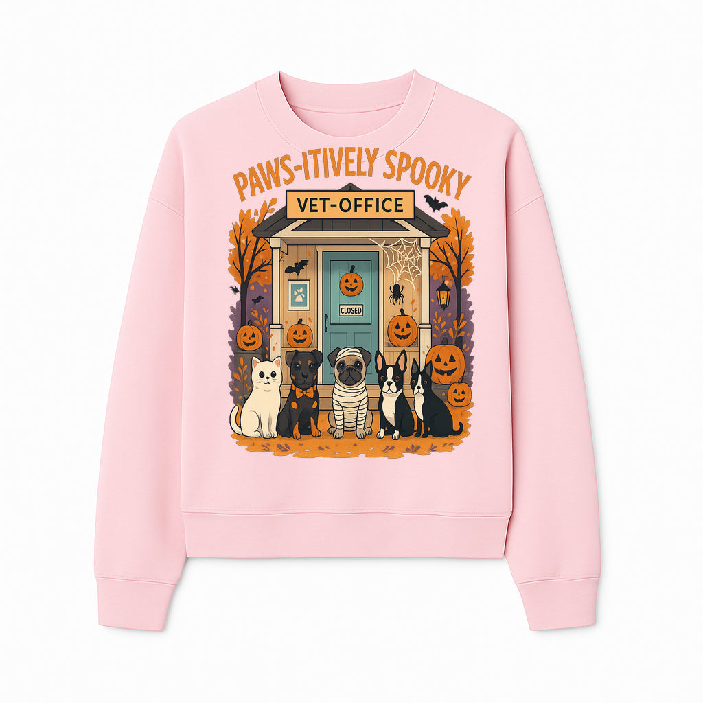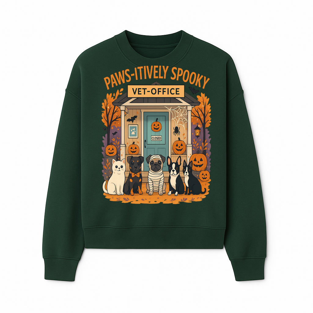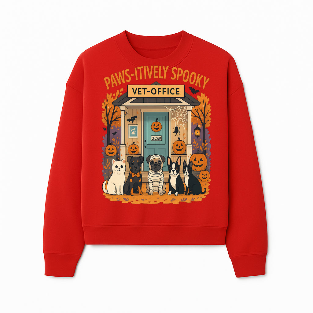 Paws-itively Spooky Vet Office Halloween Greeting Card with Cute Cats and Dogs, Pumpkin Decor, Perfect for Pet Lovers - Sweatshirt