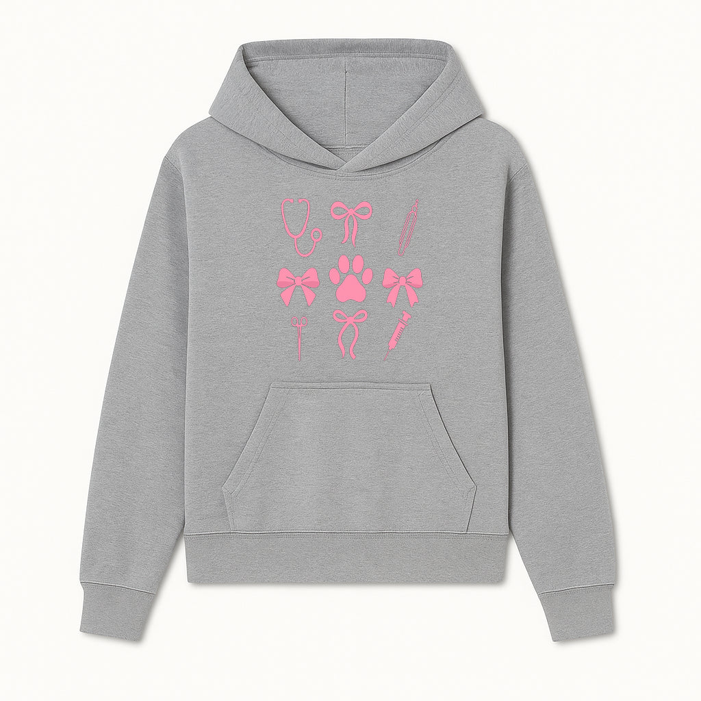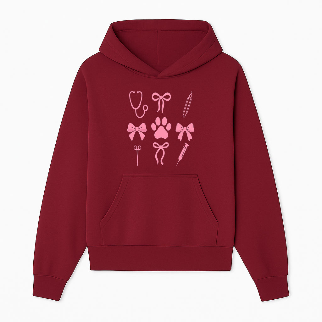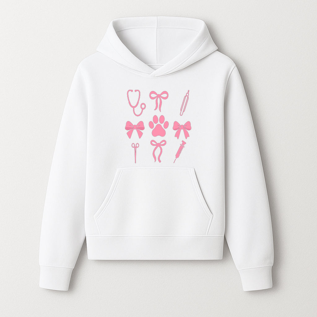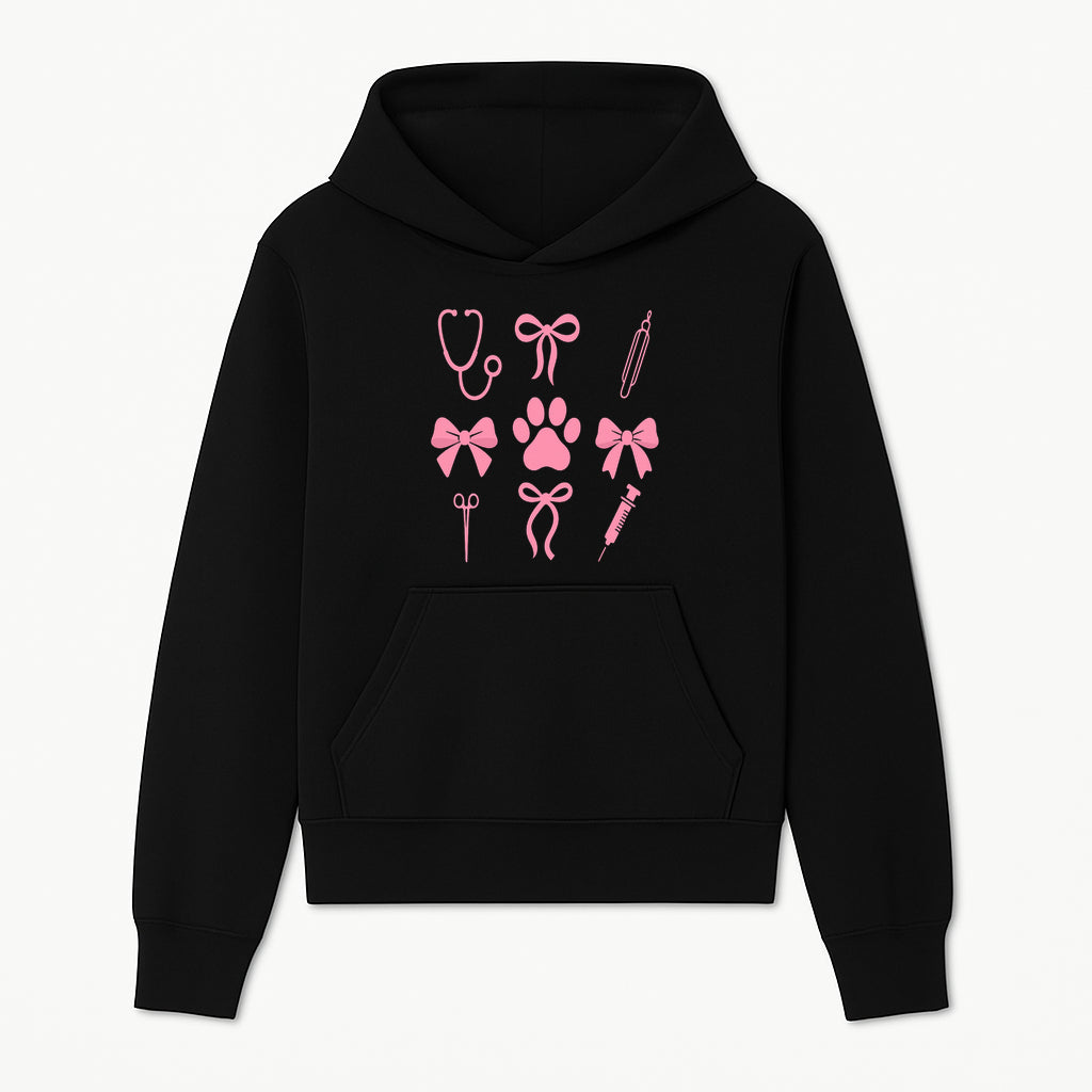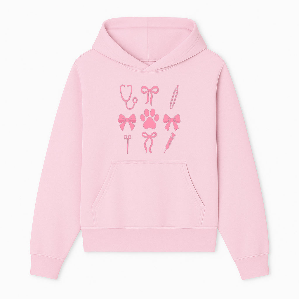 Pink Veterinary Theme Clipart | Pet Care Stethoscope, Paw Prints, Syringe & Bows | Cute Digital Graphics for Animal Lovers - Hoodie