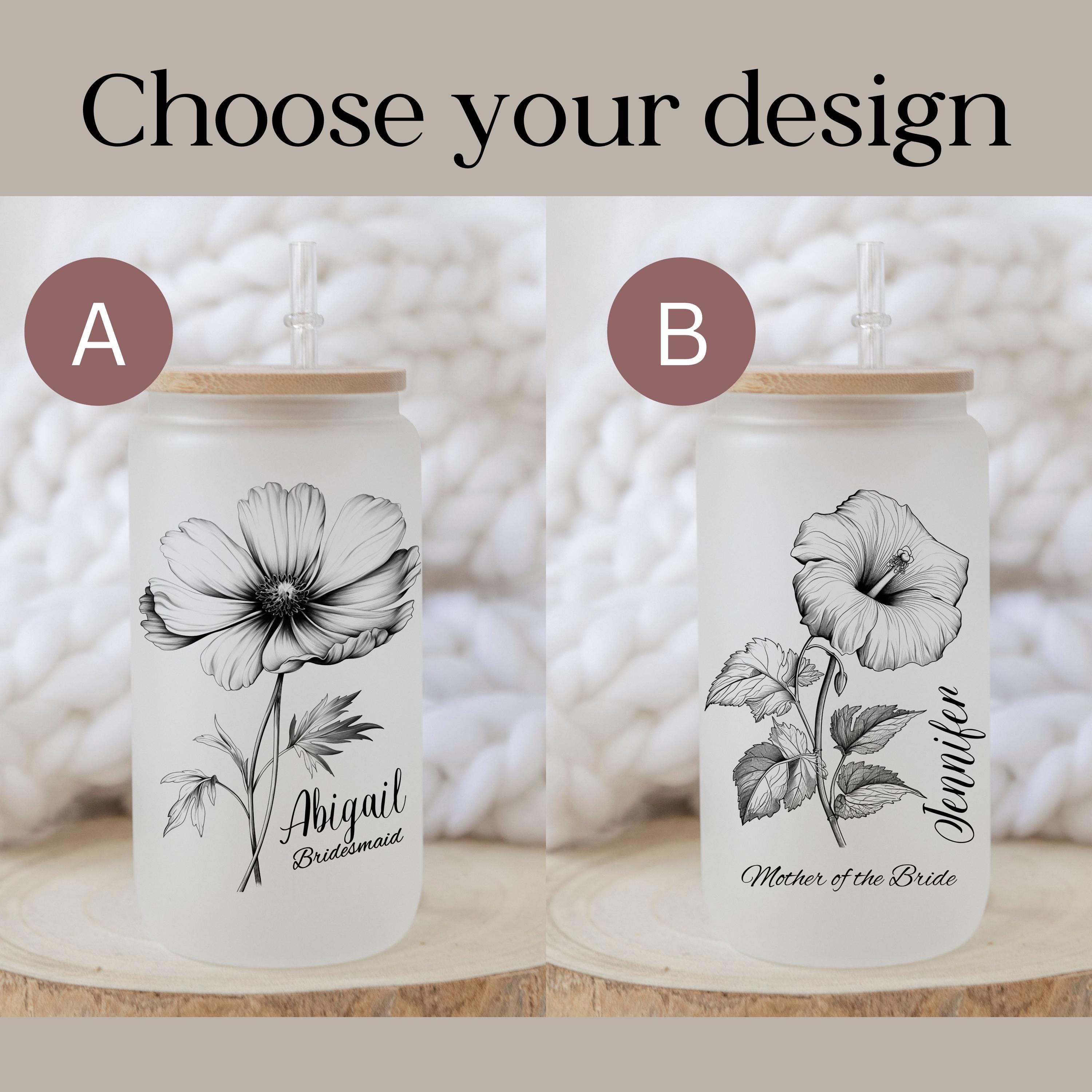 These clear or frosted glass tumblers / glass cans are personalized with the name and flower of your choice. Featuring a bamboo lid to accommodate straw usage as well as easy sipping. An inner seal ring completes the secure, push on lid to minimize accidental leakage. Paired with a reusable durable straw with a ring stopper. These make the perfect gift for a friend or yourself!