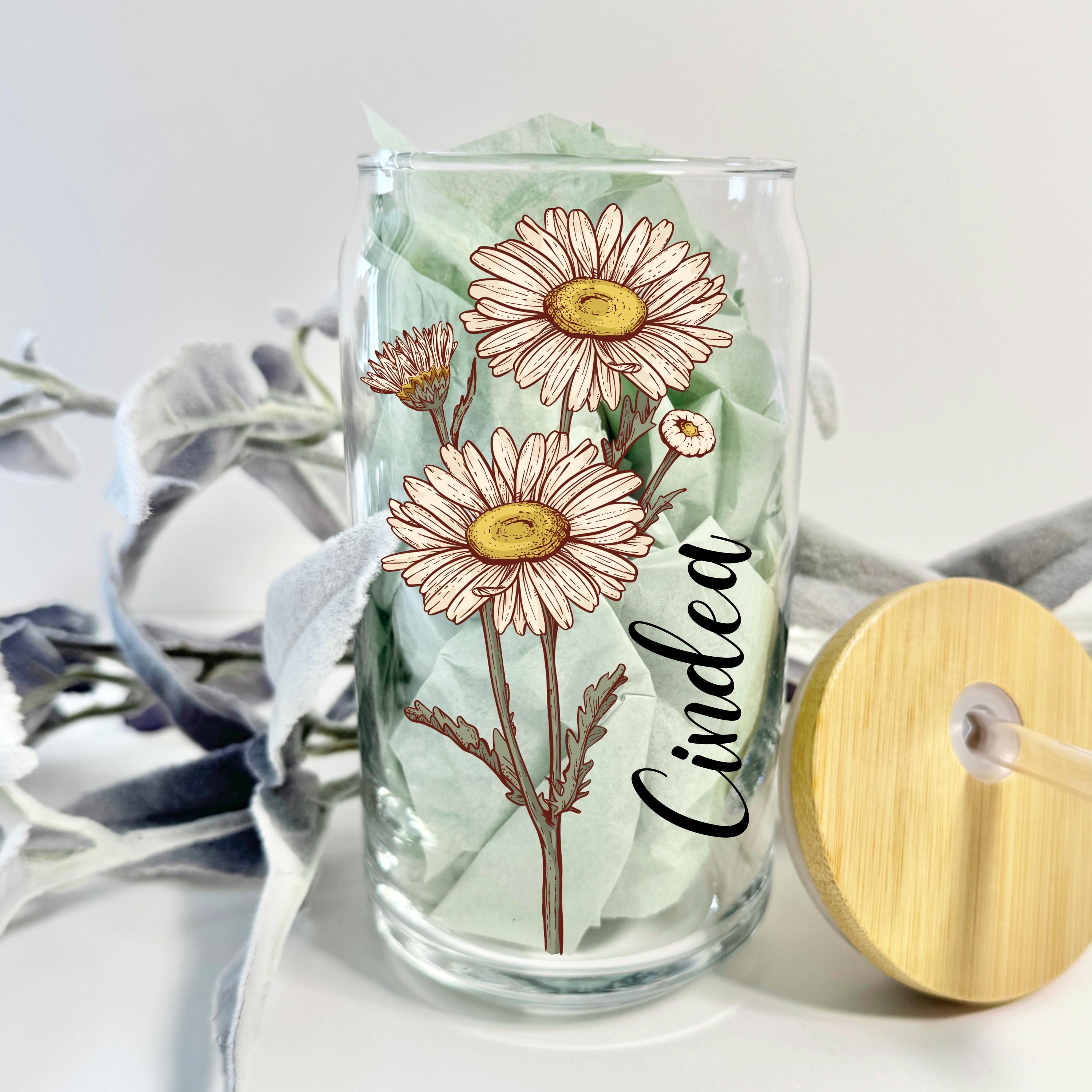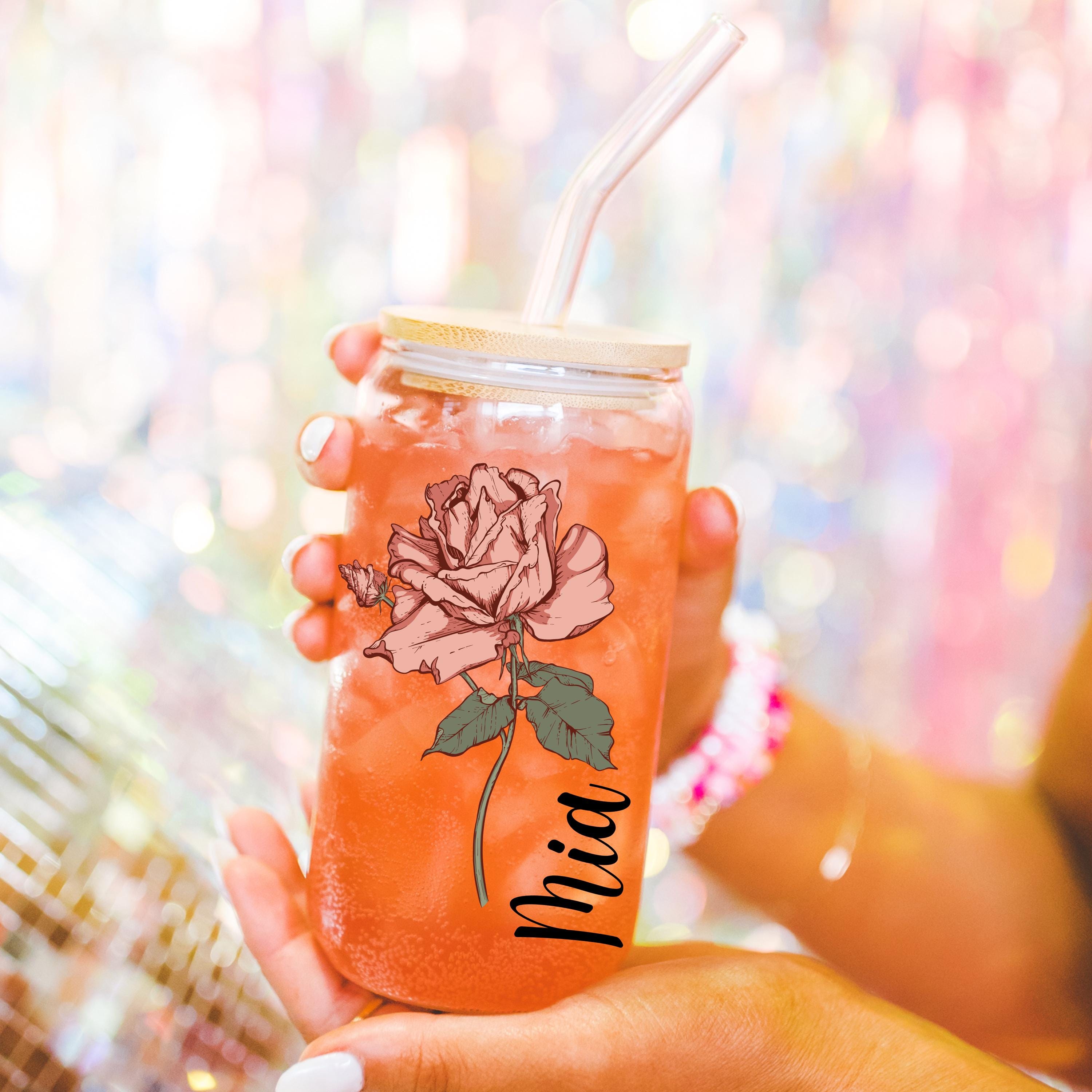 These clear or frosted glass tumblers / glass cans are personalized with the name and flower of your choice. Featuring a bamboo lid to accommodate straw usage as well as easy sipping. An inner seal ring completes the secure, push on lid to minimize accidental leakage. Paired with a reusable durable straw with a ring stopper. These make the perfect gift for a friend or yourself!