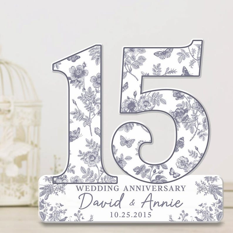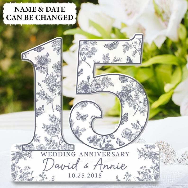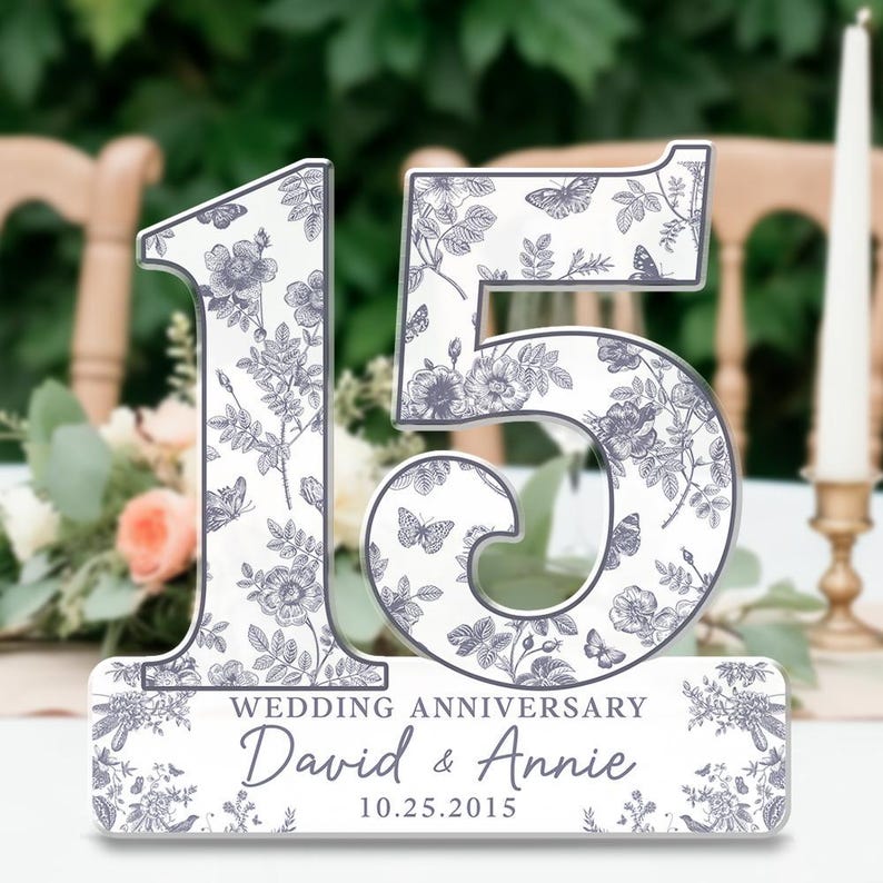 15th Wedding Anniversary Blue Toile Acrylic Plaque Gift for Husband, Personalized Couples Name Date Emerald Anniversary Gift for Couple