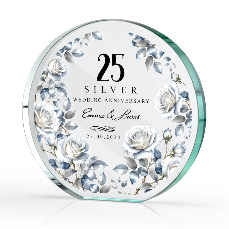 Are you looking for a unique gift that will express your joy from 25 years of life together for your parents, grandparents or friends? This elegant printed glass statuette for your silver wedding anniversary will be the perfect choice! The unique design combined with a delicate print make this statuette an unforgettable gift that will last for many years and will remind you of a special occasion.